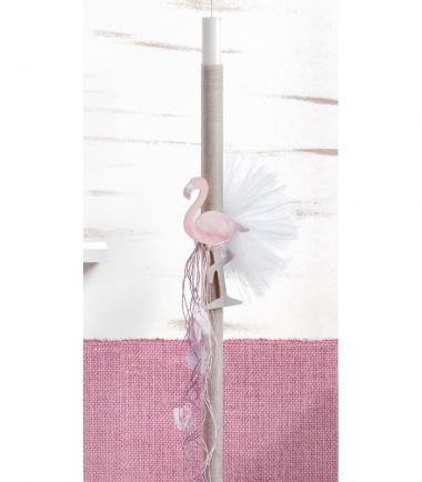 Ξύλινος λευκός κηροστάτης-κρεμάστρα,βαμμένος στο χέρι σε ροζ χρώμα στο μπροστινό τμήμα και στην πλάτη του κηροστάτη και διακοσμημένος με τούλι και με ξύλινο καδράκι οβάλ στο οποίο απεικονίζονται δύο λευκοί κύκνοι αντικριστοί και περιτριγυρισμένοι από πολλά μικρά λευκά-ροζ ανθάκια.Στην τιμή περιλαμβάνεται και το κερί για την εκκλησία.