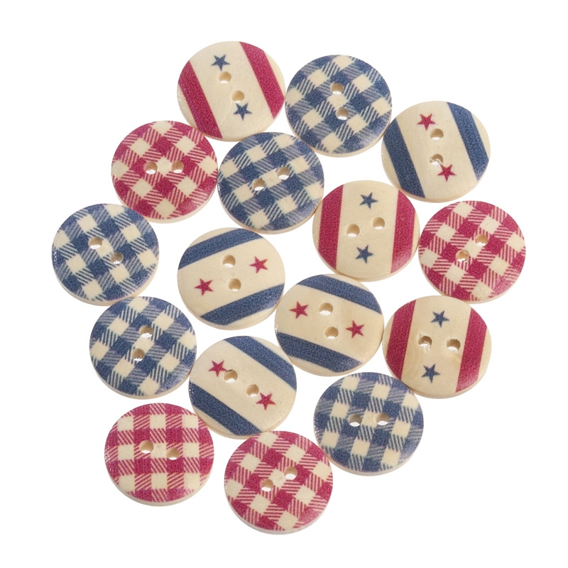 Ξύλινα κουμπιά 18mm με φυσικη βάση και διάφορους συνδυασμούς χρωμάτων με καρό και αστέρια. Κάθε συσκευασία περιέχει 60 τεμάχια και 4 διαφορετικούς συνδυασμούς χρωμάτων.
