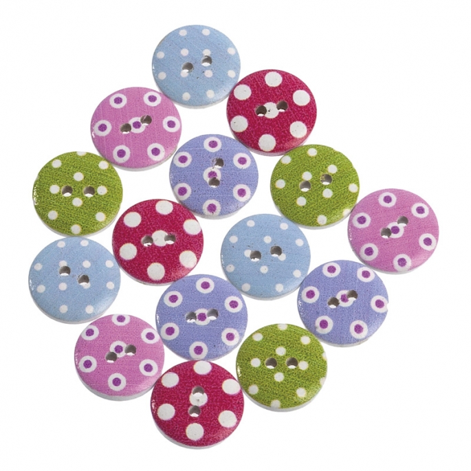 Ξύλινα κουμπιά 18mm με μονόχρωμη βάση και λευκό πουά. Κάθε συσκευασία περιλαμβάνει 50 τεμάχια και 5 διαφορετικούς συνδυασμούς χρωμάτων.