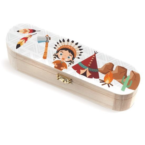 Ξύλινη natural κασετίνα με μεταλλικό κούμπωμα. Είναι διακοσμημένη με αυτοκόλλητο print ινδιάνος.