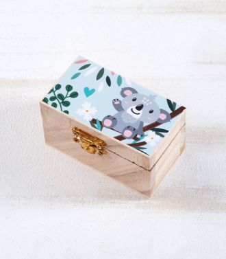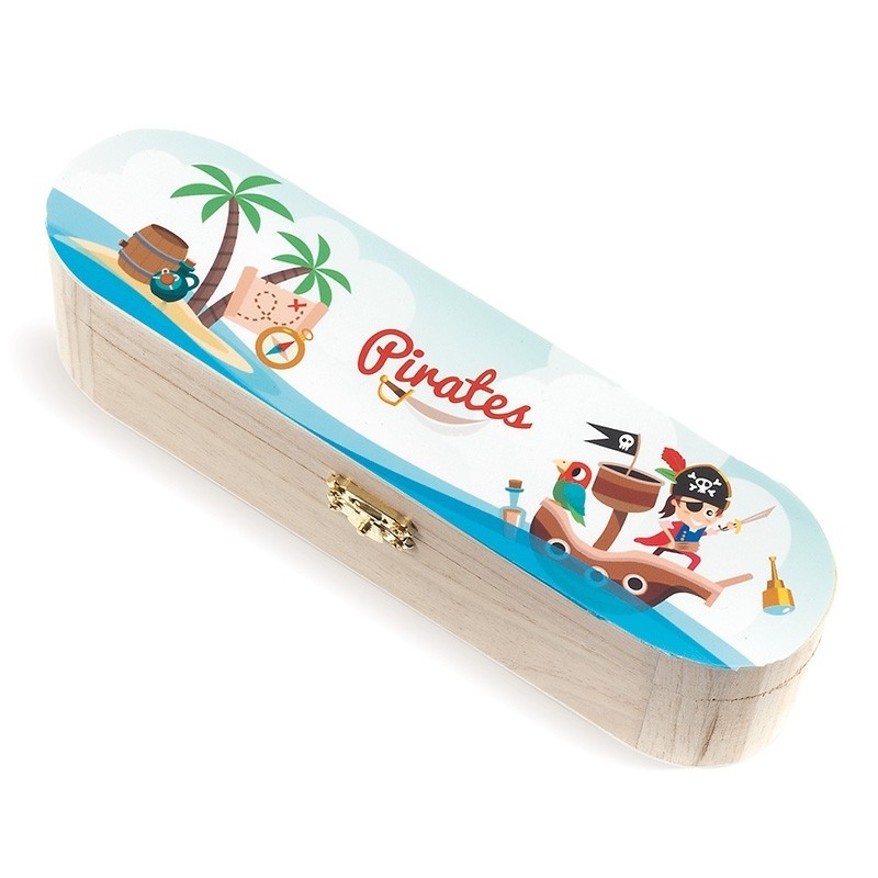 Ξύλινη natural κασετίνα με μεταλλικό κούμπωμα. Είναι διακοσμημένη με αυτοκόλλητο print πειρατής.