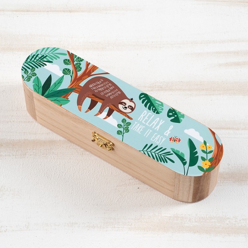 Ξύλινη natural κασετίνα με μεταλλικό κούμπωμα. Είναι διακοσμημένη με αυτοκόλλητο print Βραδύποδας.