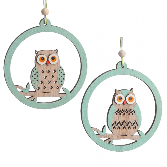 Ξύλινη κρεμαστή διακοσμητική κουκουβάγια σε χρώμα βεραμάν μέσα σε στρογγυλό πλαίσιο. Διακοσμημένο με ξύλινη χάντρα.Ο κωδικός περιλαμβάνει 2 σχέδια όπως απεικονίζονται στη φωτογραφία.
