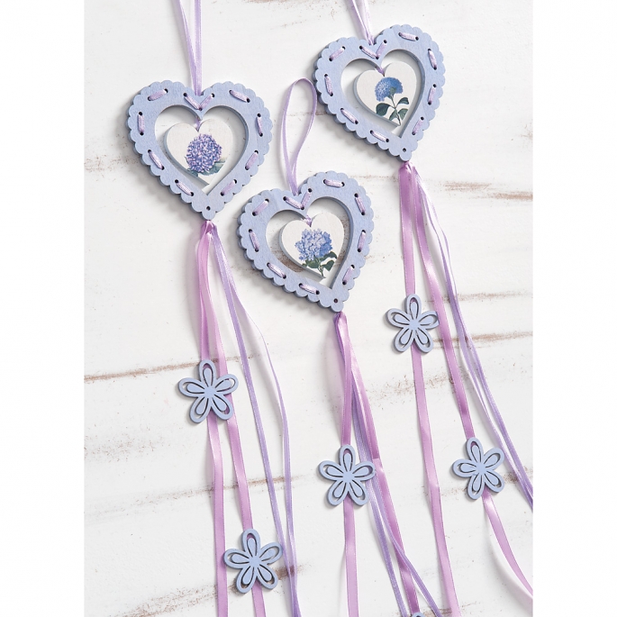 Ξύλινη κρεμαστή διακοσμητική καρδιά πλαίσιο σε χρώμα λιλά. Στολισμένη με λιλά κορδέλες, ξύλινα λουλουδάκια και print λεβάντα. Ο κωδικός περιλαμβάνει 3 σχέδια όπως απεικονίζονται στη φωτογραφία.