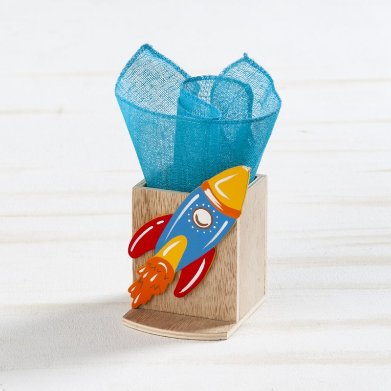 Ξύλινη μολυβοθήκη σε natural χρώμα. Είναι διακοσμημένη με ξύλινη πολύχρωμη παράσταση πύραυλο.