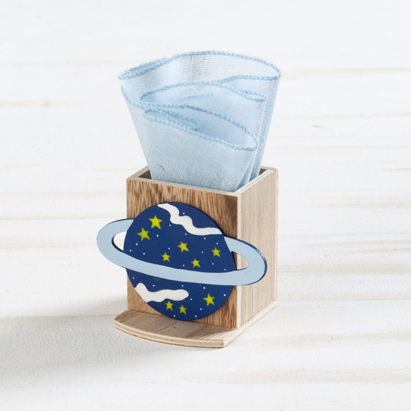 Ξύλινη μολυβοθήκη σε natural χρώμα. Είναι διακοσμημένη με ξύλινη παράσταση υδρόγειο σε μπλε χρώμα.