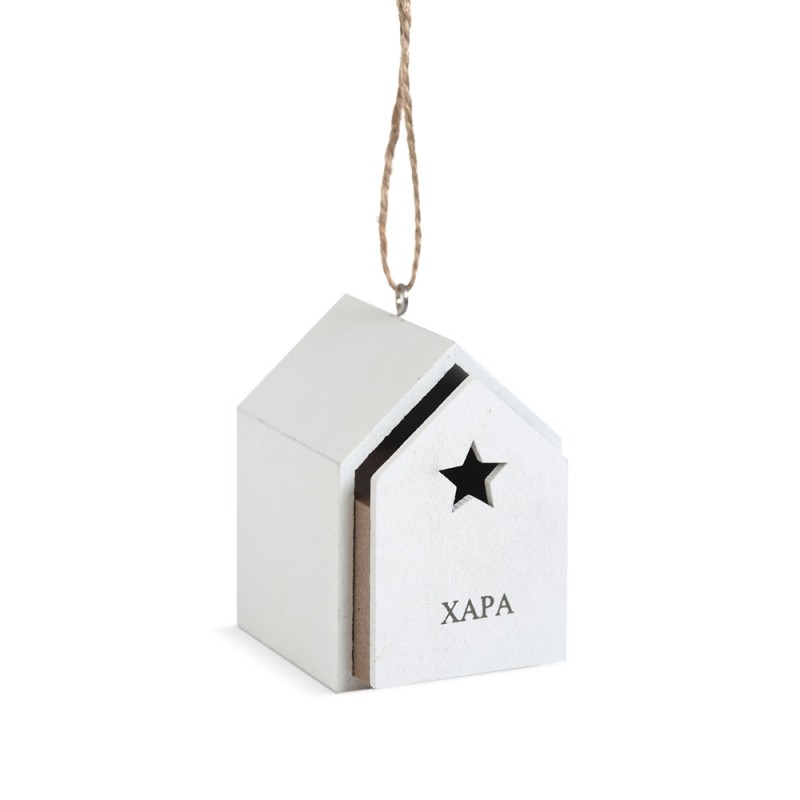 Ξύλινο κρεμαστό διακοσμητικό σπιτάκι σε λευκό χρώμα με natural συρταράκι και την λέξη “Χαρά”.
