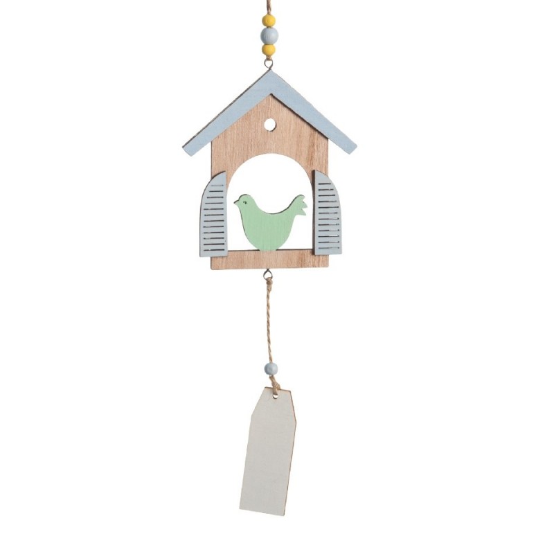 Ξύλινο κρεμαστό διακοσμητικό σπίτι με παράθυρο και πουλάκι σε χρώμα βεραμάν. Διακοσμημένο με πολύχρωμες ξύλινες χάντρες και ξύλινη ετικέτα.