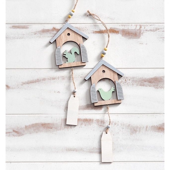 Ξύλινο κρεμαστό διακοσμητικό σπίτι με παράθυρο και ζωάκι σε χρώμα βεραμάν.