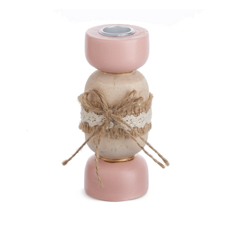 Ξύλινο επιτραπέζιο κηροπήγιο natural με λεπτομέρειες ροζ .