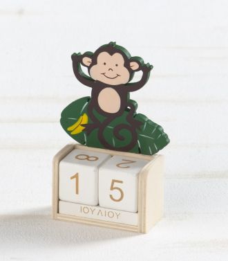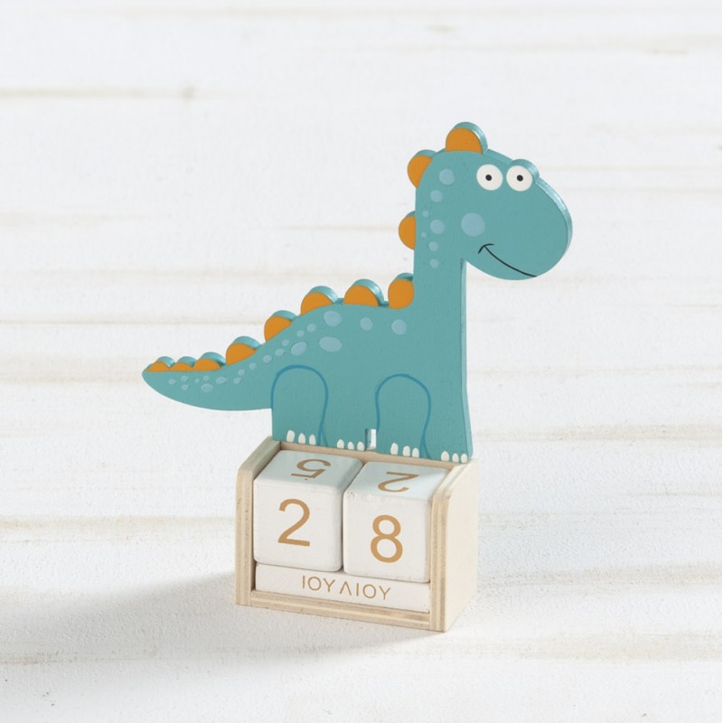 Ξύλινο natural ημερολόγιο με δυνατότητα αλλαγής της ημερομηνίας προσαρμόζοντας τα κυβάκια. Είναι διακοσμημένο με ξύλινη παράσταση δεινόσαυρος σε βεραμάν χρώμα με πορτοκαλί λεπτομέρειες.