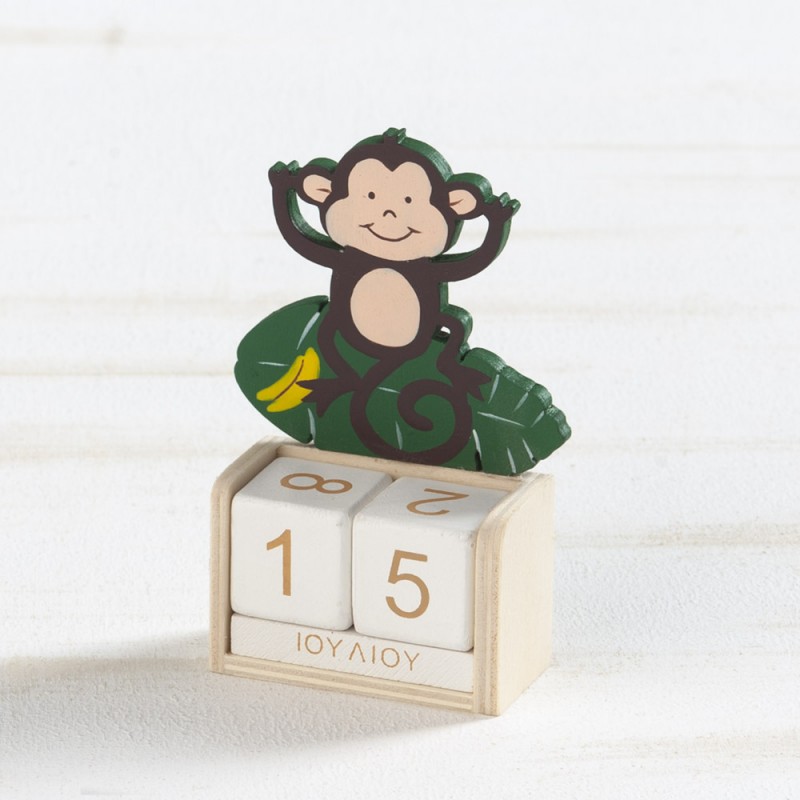 Ξύλινο natural ημερολόγιο με δυνατότητα αλλαγής της ημερομηνίας προσαρμόζοντας τα κυβάκια. Είναι διακοσμημένο με ξύλινη παράσταση μαϊμού σε καφέ χρώμα με πράσινο φύλλο.