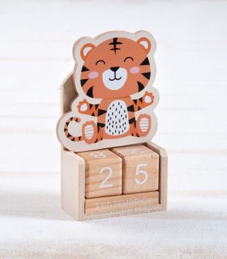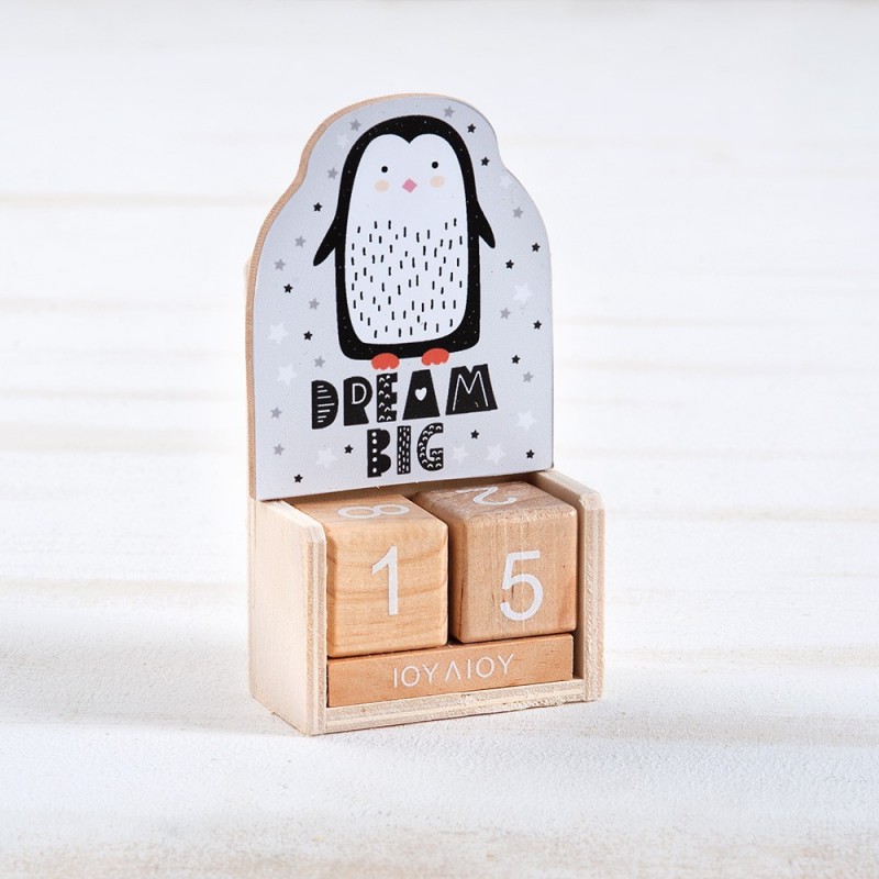 Ξύλινο ημερολόγιο με κύβους σε natural χρώμα. Διακοσμημένο με κοπτικό Πιγκουίνος.