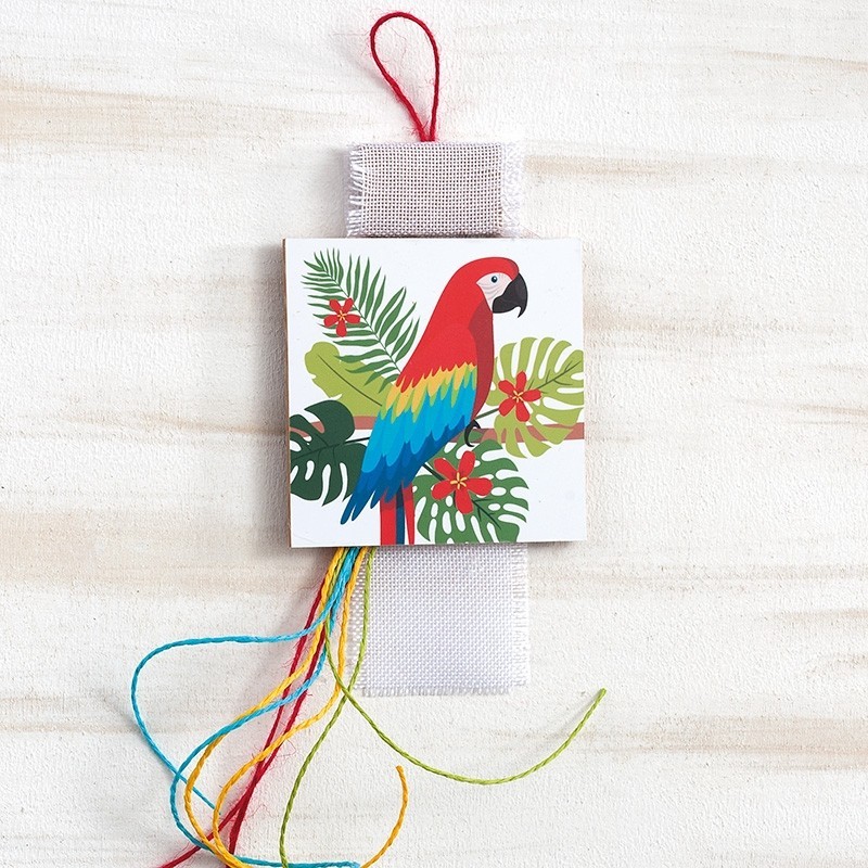 Ξύλινο διακοσμητικό καδράκι παπαγάλος κρεμαστό με λινάτσα και πολύχρωμα κορδόνια.