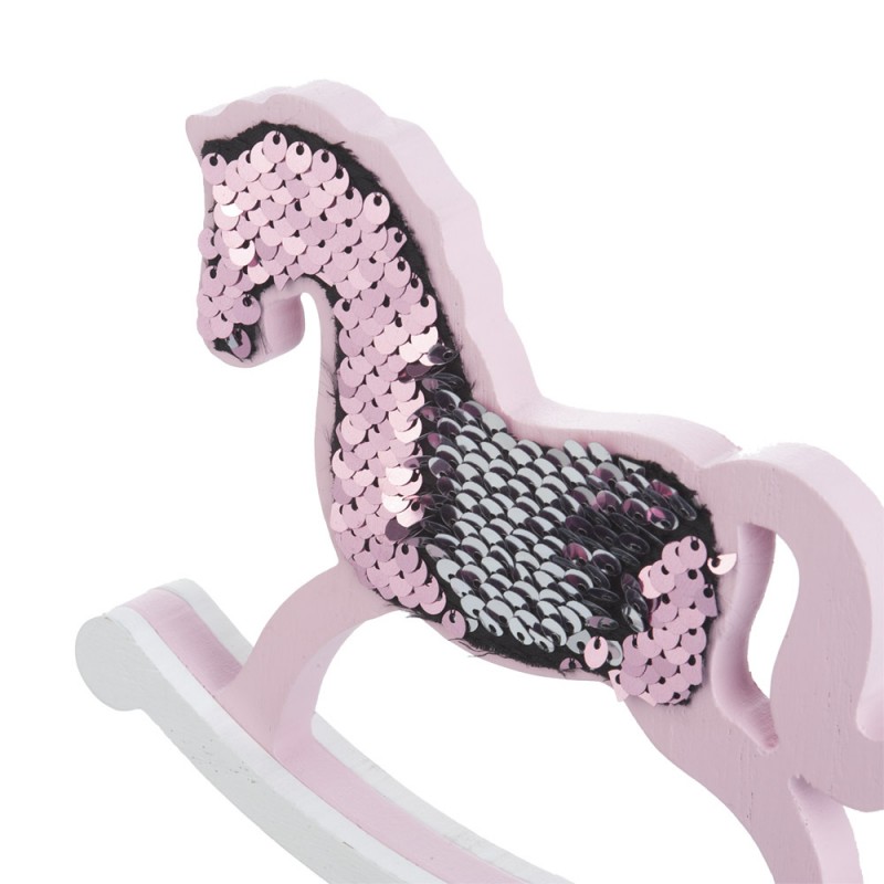 Ξύλινο διακοσμητικό κουνιστό άλογο σε ροζ χρώμα με πούλιες ροζ που αλλάζουν σε ασημί.