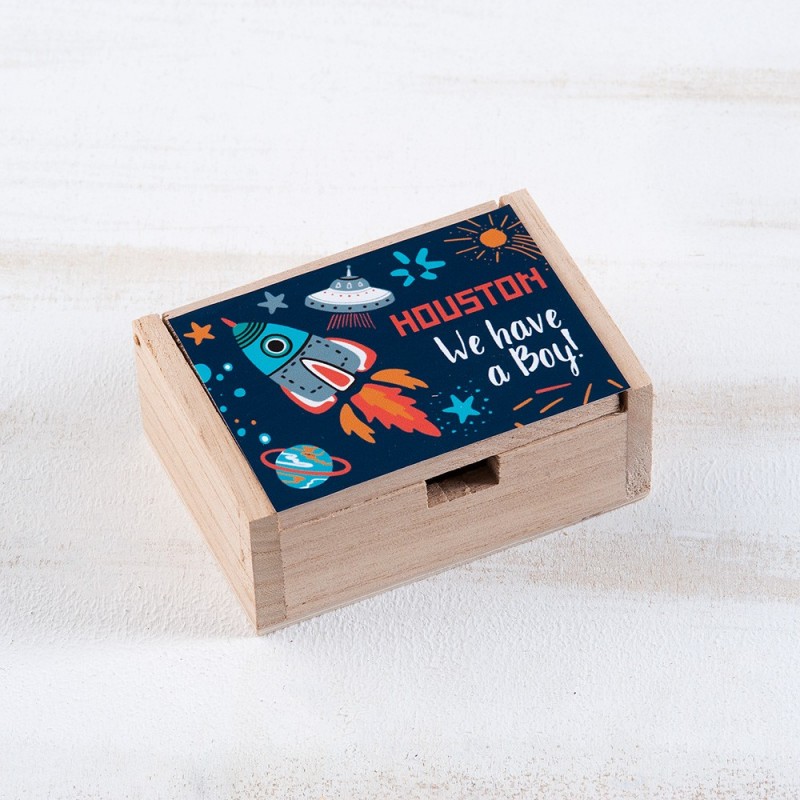 Ξύλινο natural παραλληλόγραμο κουτί. Είναι διακοσμημένο με αυτοκόλλητο print Διάστημα.