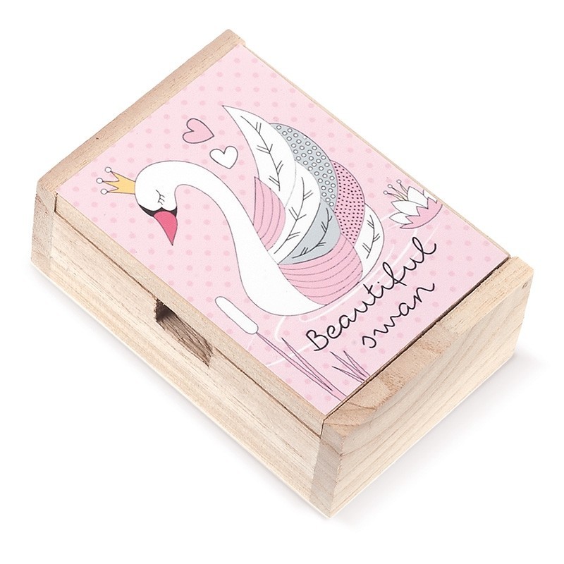 Ξύλινο natural παραλληλόγραμο κουτί. Είναι διακοσμημένο με αυτοκόλλητο print κύκνος.