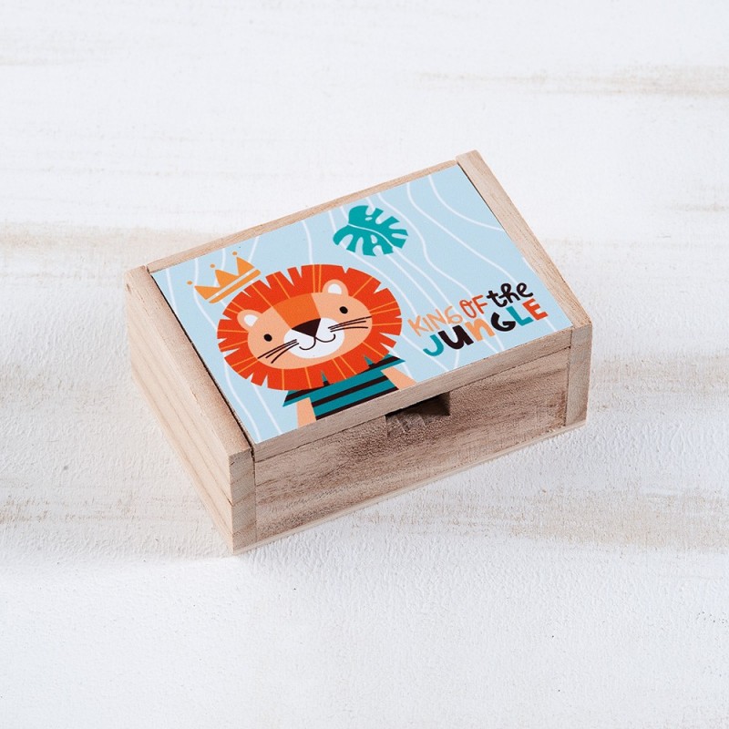 Ξύλινο natural παραλληλόγραμο κουτί. Είναι διακοσμημένο με αυτοκόλλητο print Λιοντάρι.