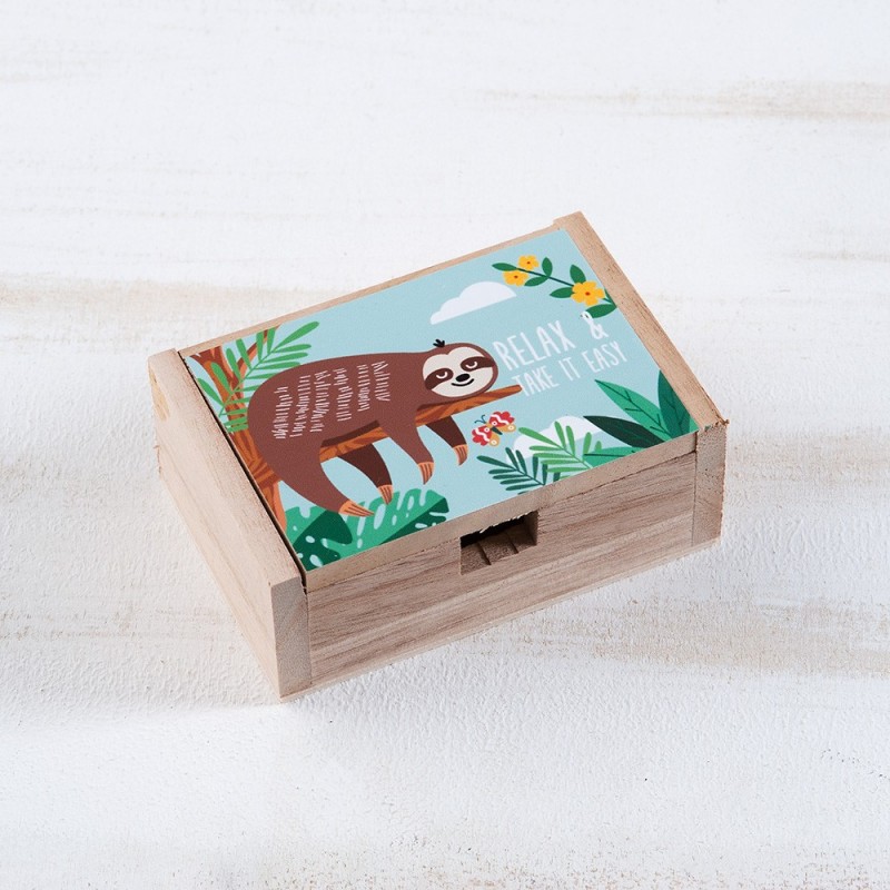 Ξύλινο natural παραλληλόγραμο κουτί. Είναι διακοσμημένο με αυτοκόλλητο print Βραδύποδας.
