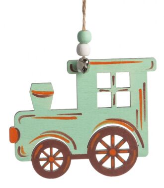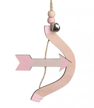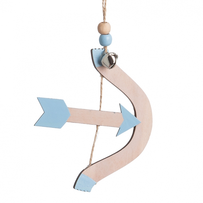Ξύλινο κρεμαστό τόξο με βέλος σε natural και σιελ χρώμα, διακοσμημένος με χάντρες και μεταλλικό κουδουνάκι. Ιδανικό για διακόσμηση.