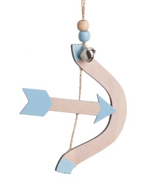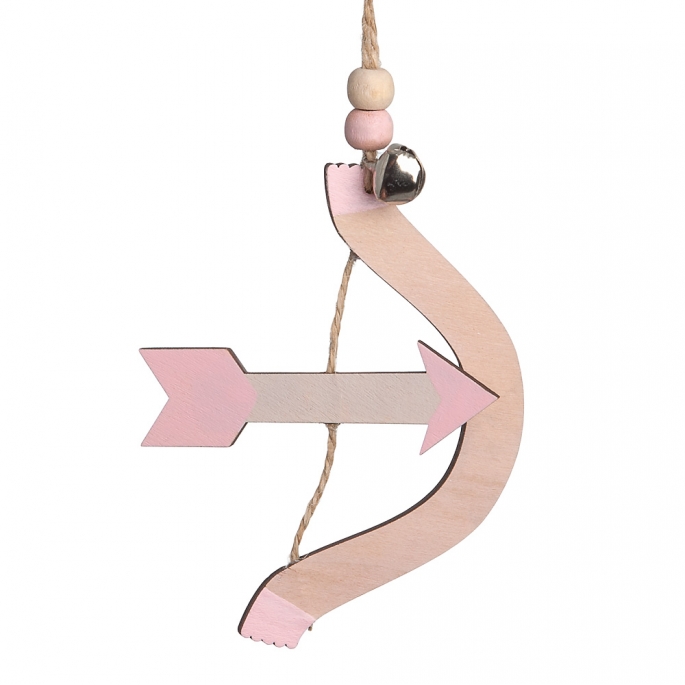 Ξύλινο κρεμαστό τόξο με βέλος σε natural και ροζ χρώμα, διακοσμημένος με χάντρες και μεταλλικό κουδουνάκι. Ιδανικό για διακόσμηση.