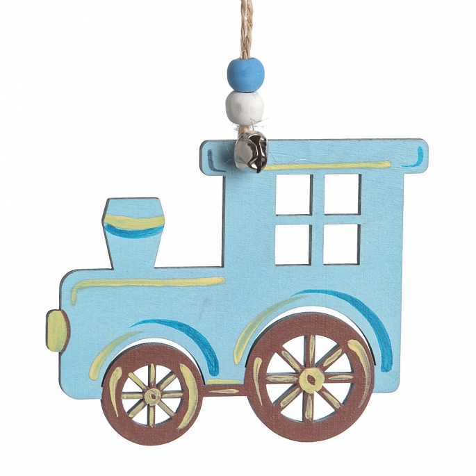 Ξύλινο κρεμαστό τρένο σε σιέλ χρώμα με καφέ λεπτομέρειες, διακοσμημένο με χάντρες και μεταλλικό κουδουνάκι. Ιδανικό για διακόσμηση. Στη πίσω όψη μόνο σιέλ.