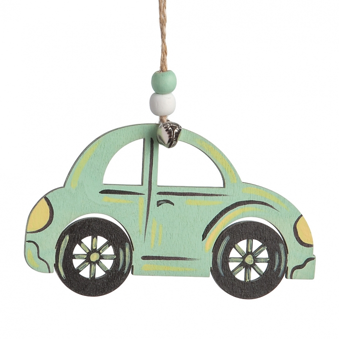 Ξύλινο κρεμαστό αυτοκίνητο σε βεραμάν χρώμα διακοσμημένο με χάντρες και μεταλλικό κουδουνάκι. Ιδανικό για διακόσμηση. Βεραμάν και στις 2 όψεις.