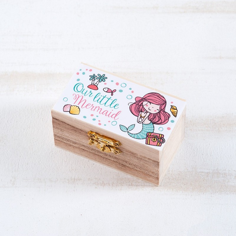 Ξύλινο natural σεντούκι με μεταλλικό κούμπωμα. Είναι διακοσμημένο με αυτοκόλλητο print Γοργόνα.
