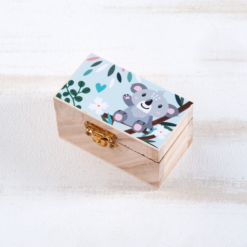 Ξύλινο natural σεντούκι με μεταλλικό κούμπωμα. Είναι διακοσμημένο με αυτοκόλλητο print Koala.