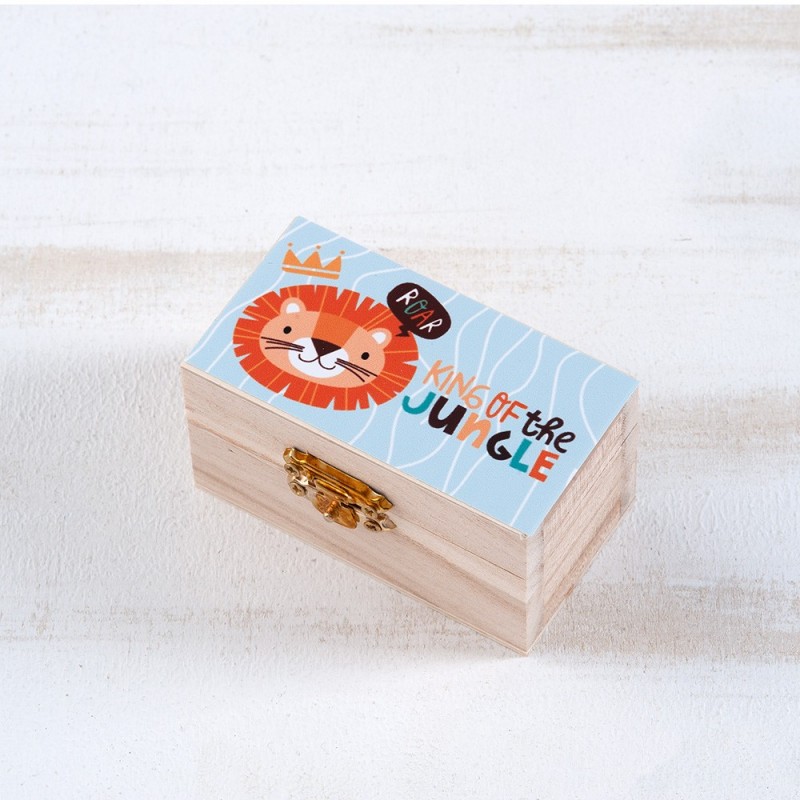 Ξύλινο natural σεντούκι με μεταλλικό κούμπωμα. Είναι διακοσμημένο με αυτοκόλλητο print Λιοντάρι.