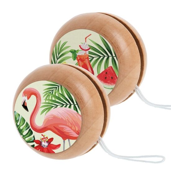 Ξύλινο natural γιο-γιο με σκοινάκι. Είναι διακοσμημένο με αυτοκόλλητο print flamigo με διαφορετικό σχέδιο μπρος-πίσω.