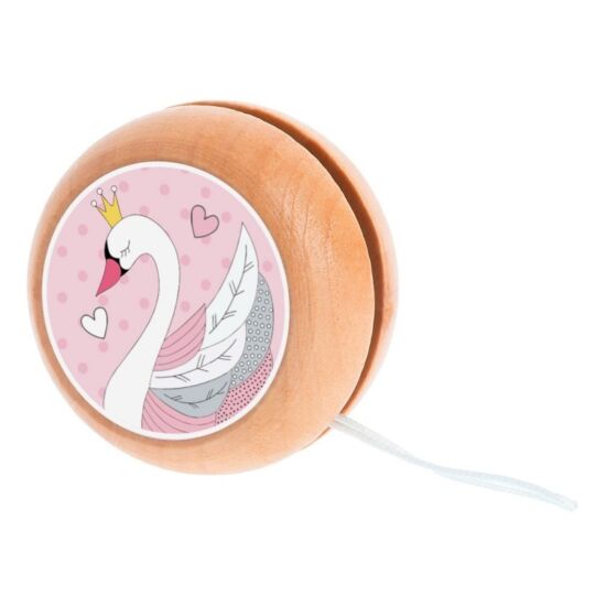 Ξύλινο natural γιο-γιο με σκοινάκι. Είναι διακοσμημένο με αυτοκόλλητο print κυκνος με διαφορετικό σχέδιο μπρος-πίσω.