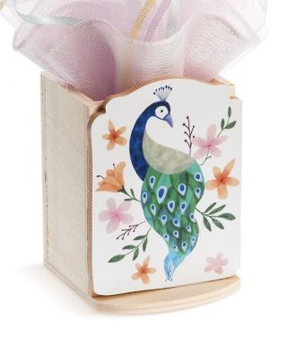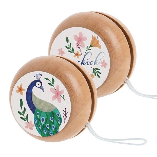 Ξύλινο natural γιο-γιο με σκοινάκι. Είναι διακοσμημένο με αυτοκόλλητο print παγώνι με διαφορετικό σχέδιο μπρος-πίσω.