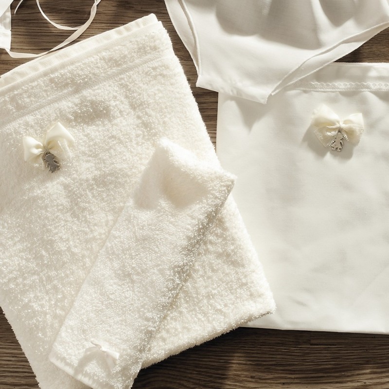 Σετ λαδόπανα βάπτισης για κορίτσι σε εκρού χρώμα με φιογκάκι και διακοσμητικό κοριτσάκι. Στο σετ περιλαμβάνεται το λαδόπανο, τα εσώρουχα,η πετσέτα η μεγάλη και η μικρή των χεριών
