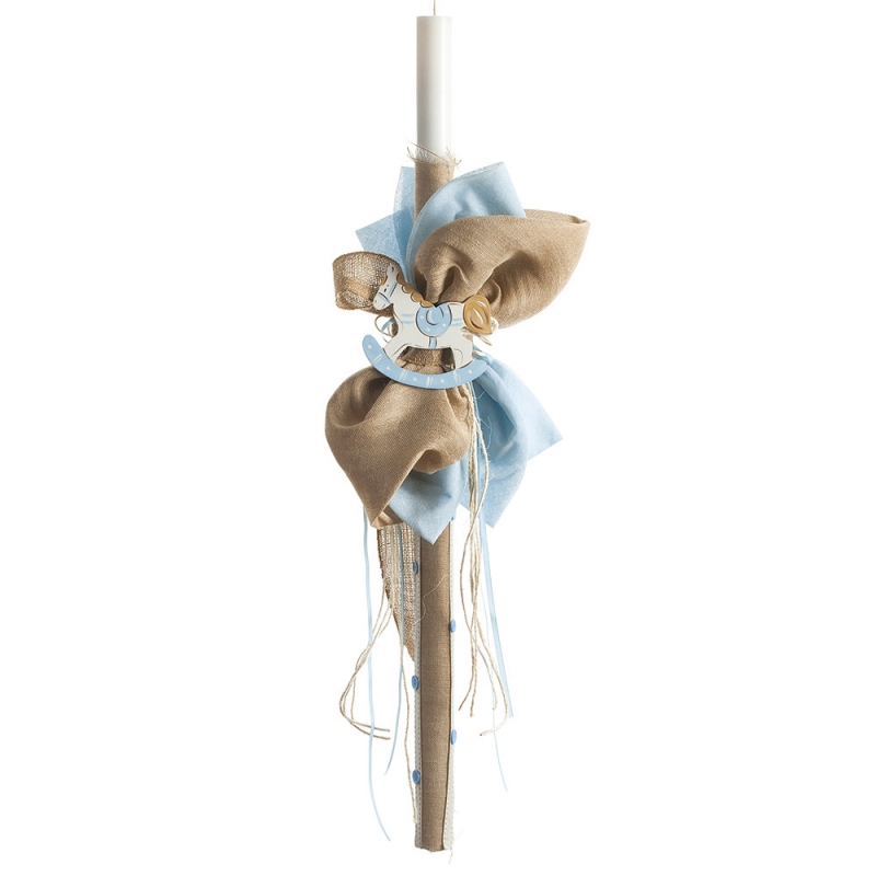 Λαμπάδα βάπτισης δεμένη με λινάτσα καφέ και διακοσμημένη με λινάτσα καφέ,ύφασμα λινό σιέλ,ξύλινο αλογάκι σιέλ και κορδόνια εκρού-σιέλ