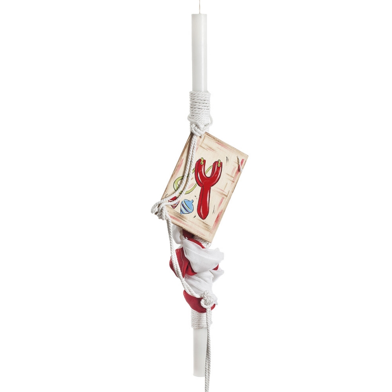 Λαμπάδα βάπτισης,δεμένη με κορδόνι λευκό και διακοσμημένη με γάζα λευκή και κόκκινη και με καδράκι ξύλινο με διάφορα πολύχρωμα παιδικά παιχνίδια σε φόντο φυσικό με σβησίματα καφέ-κόκκινα