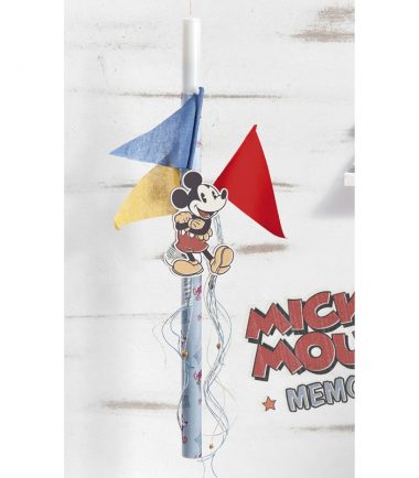 Disney λαμπάδα βάπτισης δεμένη με ύφασμα λινό καφέ και σιέλ και διακοσμημένη με ξύλινο καδράκι που απεικονίζει τον mickey χαρούμενο να δείχνει την πόλη του και τα αερόστατά του που ανεβαίνουν ψηλά στον ουρανό