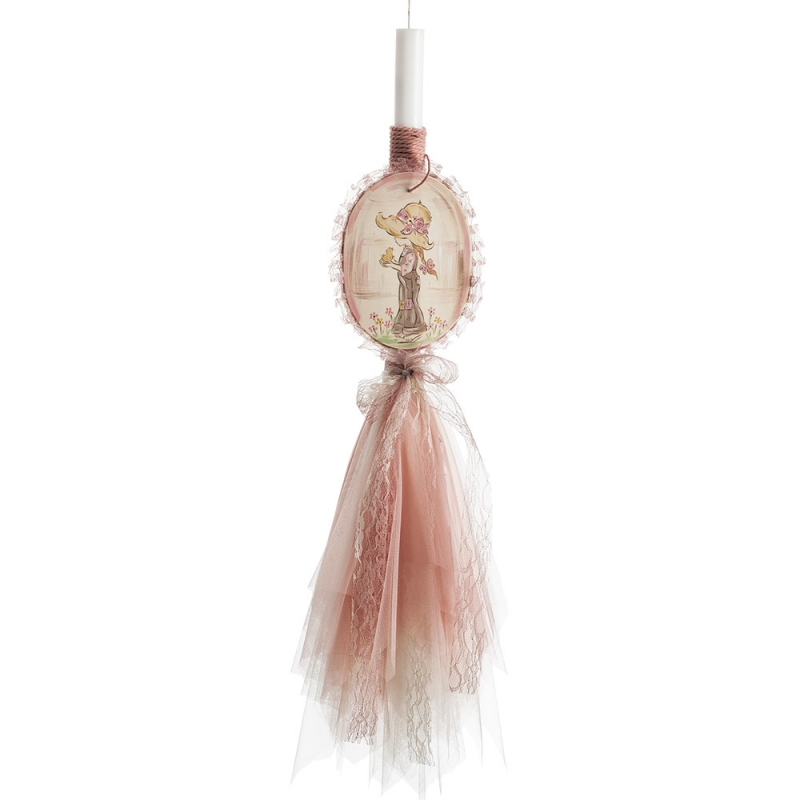 Λαμπάδα βάπτισης,τυλιγμένη με κορδόνι σε σάπιο μήλο χρώμα,δεμένη με τούλι ριχτό ανάλαφρα και δαντέλα κορδέλα σε χρώμα εκρού και σάπιο μήλο.Τη λαμπάδα διακοσμεί επίσης ξύλινο οβάλ καδράκι που απεικονίζει τη Sarah Kay να στέκεται ανάμεσα σε πολύχρωμα λουλούδια κρατώντας ένα πουλάκι και παίζοντας μαζί του.