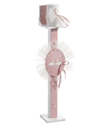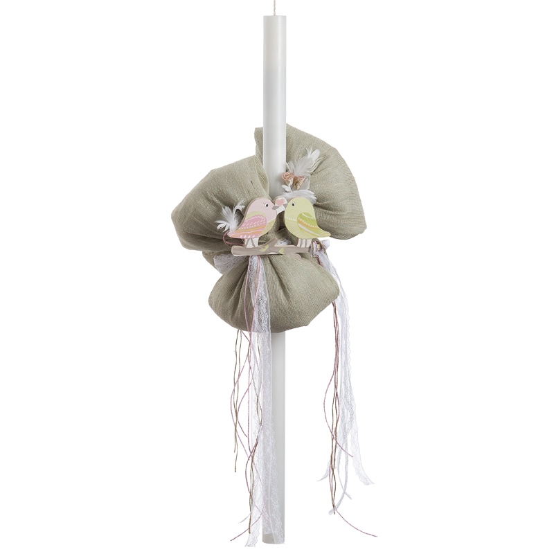 Λαμπάδα βάπτισης δεμένη με φιόγκους από φλάμα λαδί και διακοσμημένη με ξύλινη παράσταση με πουλάκια πάνω σε κλαδί δέντρου σε αποχρώσεις ροζ,βεραμάν με κρεμαστές δαντέλες λευκές και κορδόνια ροζ