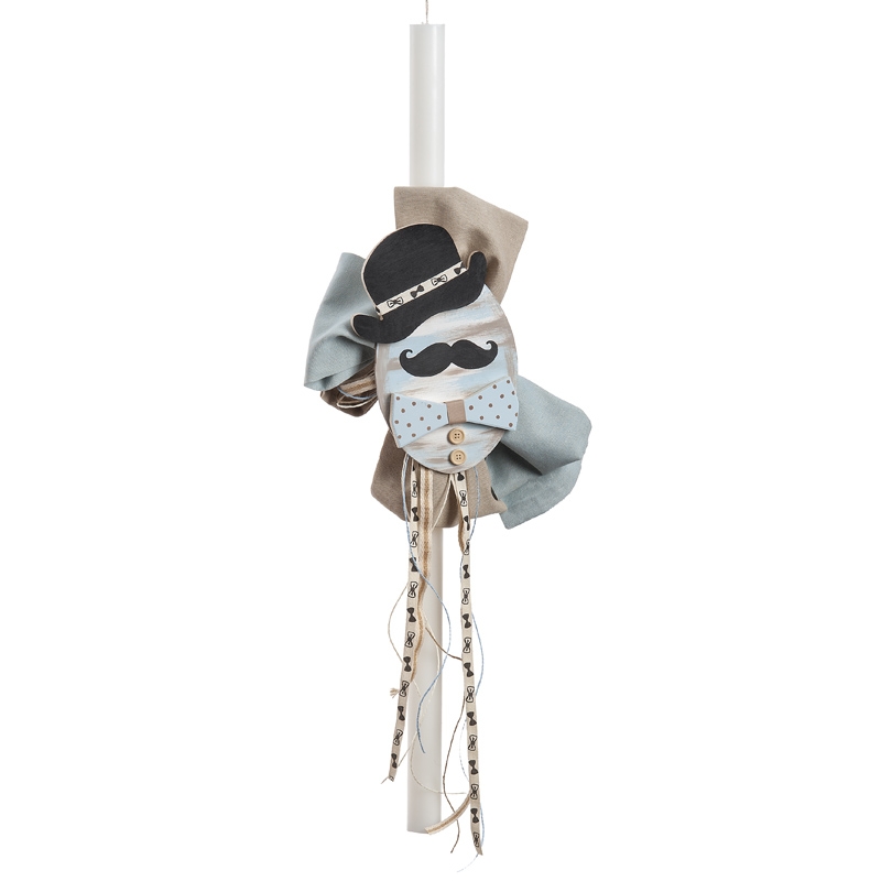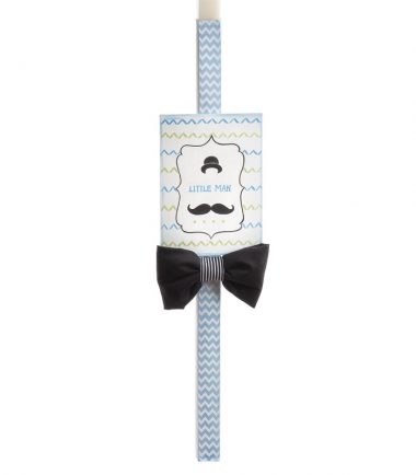 Λαμπάδα βάπτισης διακοσμημένη με λινούς φιόγκους σιέλ-καφέ και ξύλινο οβάλ καδράκι Little Man με καπέλο,μουστάκι και παπιγιόν σε αποχρώσεις σιέλ-καφέ