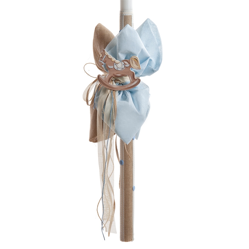 Λαμπάδα βάπτισης τυλιγμένη με λινάτσα σε φυσικό χρώμα,στολισμένη με λινάτσα και γάζα σιέλ δεμένα με κορδέλες εκρού-καφέ και διακοσμημένη με ξύλινο καρουζέλ σε καφέ-σιέλ χρώμα