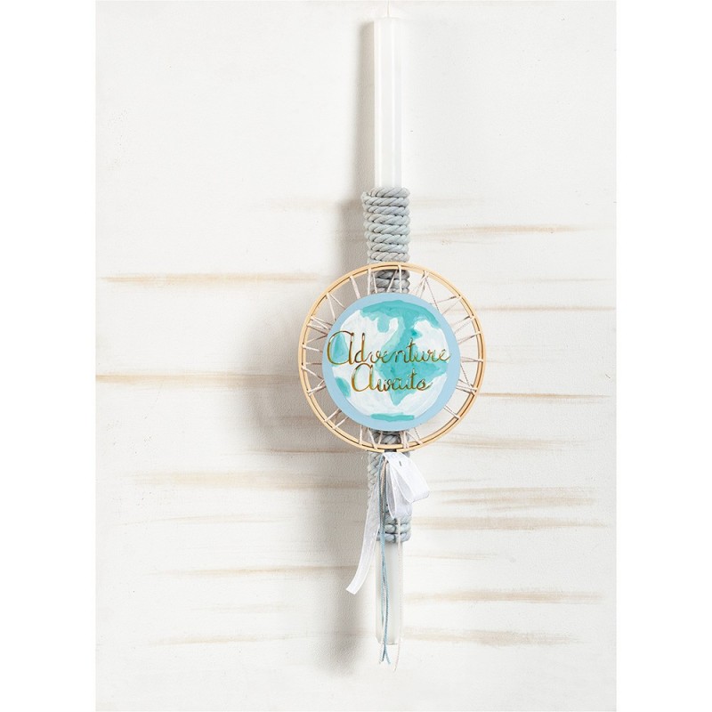 Λαμπάδα βάπτισης τυλιγμένη με κορδόνι βαμβακερό σε σιέλ απόχρωση. Είναι διακοσμημένη με στρογγυλό καδράκι που απεικονίζει την υδρόγειο και έχει γραμμένο το logo adventure awaits. Το καδράκι είναι τοποθετημένο πάνω σε πλεκτή ονειροπαγίδα και ο φιόγκος του αποτελείται από λινή λευκή κορδέλα και rayon κορδόνια σε διάφορα χρώματα.