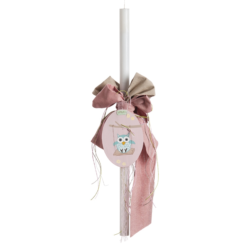 Λαμπάδα βάπτισης δεμένη με λινούς φιόγκους εκρού-ροζ και διακοσμημένη με ξύλινο ροζ καδράκι στο οποίο απεικονίζεται μια κουκουβάγια χαρούμενη να κάνει κούνια,η οποία κρέμεται από ένα κλαδί δέντρου