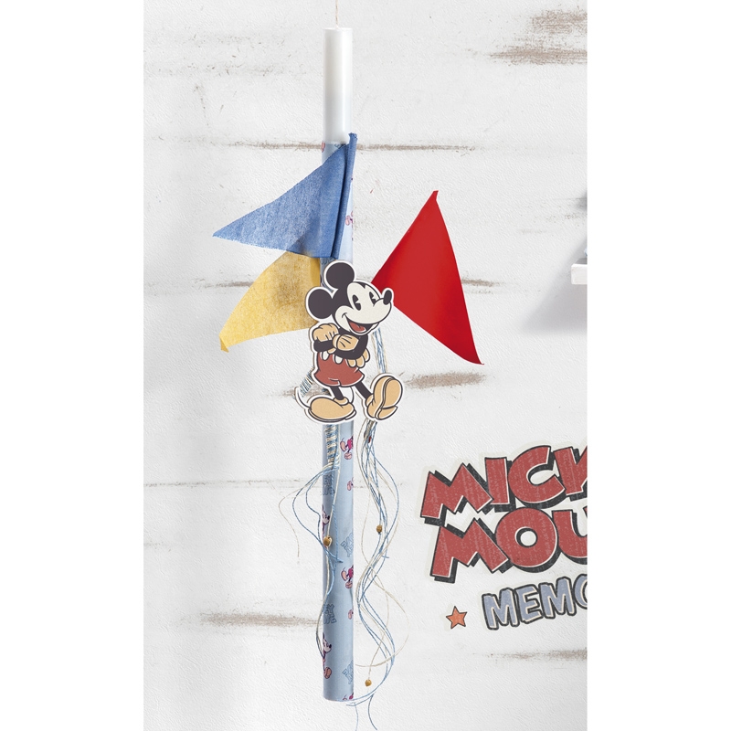 Disney λαμπάδα βάπτισης τυλιγμένη με ύφασμα τυπωμένο με τον Mickey Mouse σε σιέλ απόχρωση και διακοσμημένη με ξύλινη φιγούρα του Mickey και με σημαιάκια σε χρώματα κόκκινο,μπλε και κίτρινο.