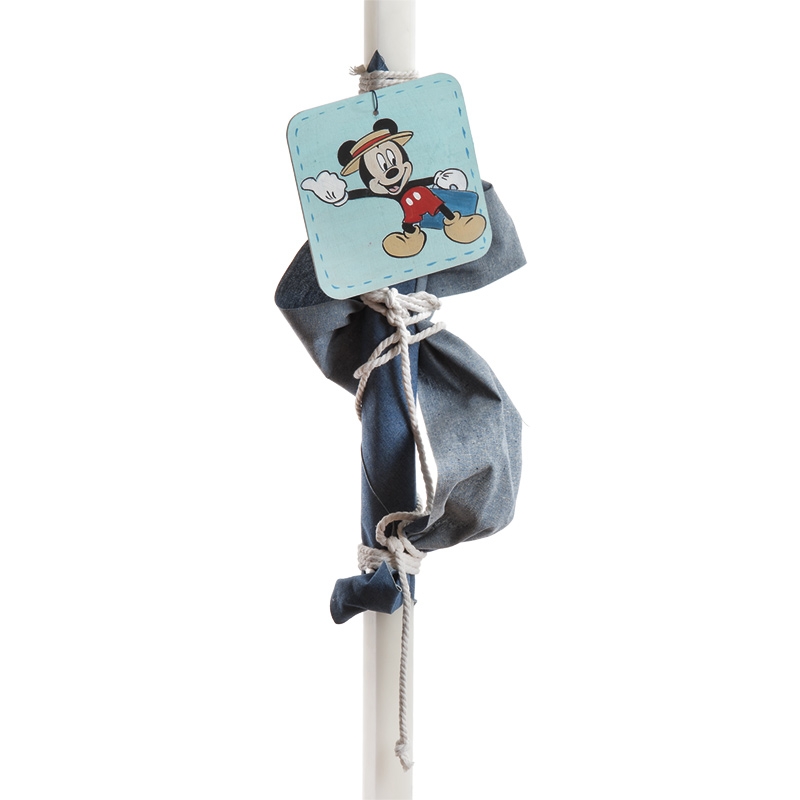 Disney λαμπάδα βάπτισης με θέμα τον mickey little traveller δεμένη με ύφασμα μπλε τύπου τζιν και διακοσμημένη με ξύλινο καδράκι που απεικονίζει τον mickey να κρατάει τη βαλίτσα του και να κάνει σήμα ωτοστόπ.
