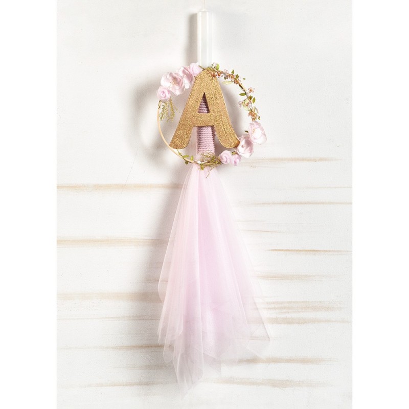 Η λαμπάδα είναι διακοσμημένη σε ροζ απαλές αποχρώσεις. Το επάνω μέρος είναι τυλιγμένο με ροζ βαμβακερό κορδόνι και στο κάτω μέρος πέφτει χυτό ροζ τούλι. Η συγκεκριμένη πρόταση συμπληρώνεται από ένα στεφάνι γεμάτο λουλούδια και το χρυσό μονόγραμμα του παιδιού.