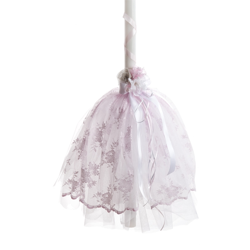 Λαμπάδα βάπτισης τυλιγμένη με κορδέλα σατέν λευκή,δεμένη πλούσια με τούλι,δαντέλα ροζ και λουλουδάκια