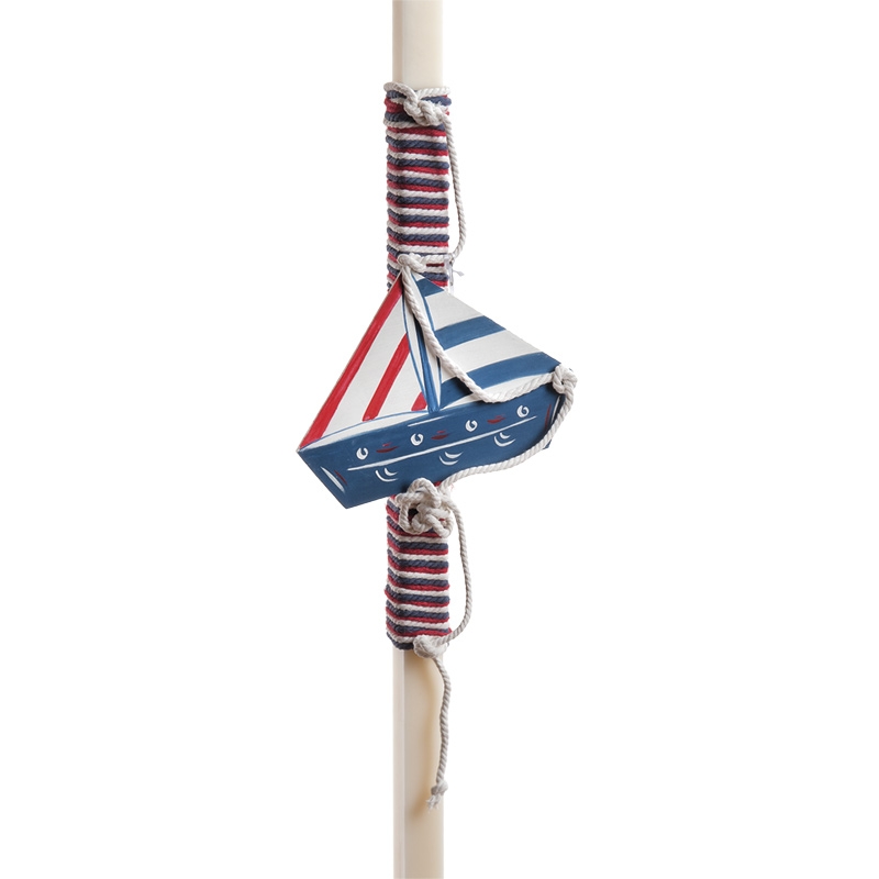 Λαμπάδα βάπτισης σε ναυτικό στυλ δεμένη με κορδόνι λευκό-μπλε-κόκκινο και διακοσμημένη με ξύλινο καράβι μπλε-κόκκινο