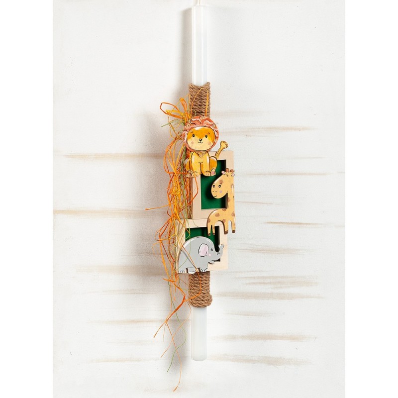 Η λαμπάδα είναι διακοσμημένη με ξύλινες παραστάσεις από τα ζωάκια της ζούγκλας και πιο συγκεκριμένα το λιοντάρι,την καμηλοπάρδαλη και τον ελέφαντα. Η λαμπάδα είναι τυλιγμένη με natural κορδόνι γιούτα ενώ τα πολύχρωμα paper κορδόνια προσθέτουν ακόμη περισσότερο χρώμα.