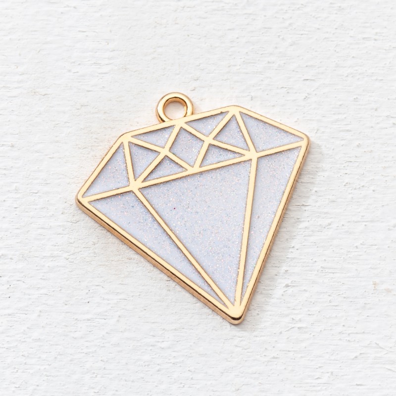 Μεταλλικό κρεμαστό διακοσμητικό διαμάντι σε χρυσό χρώμα με σμάλτο λευκό. Κατάλληλο για διακοσμήσεις και χειροποίητες κατασκευές. Η συσκευασία περιέχει 10 τεμάχια.